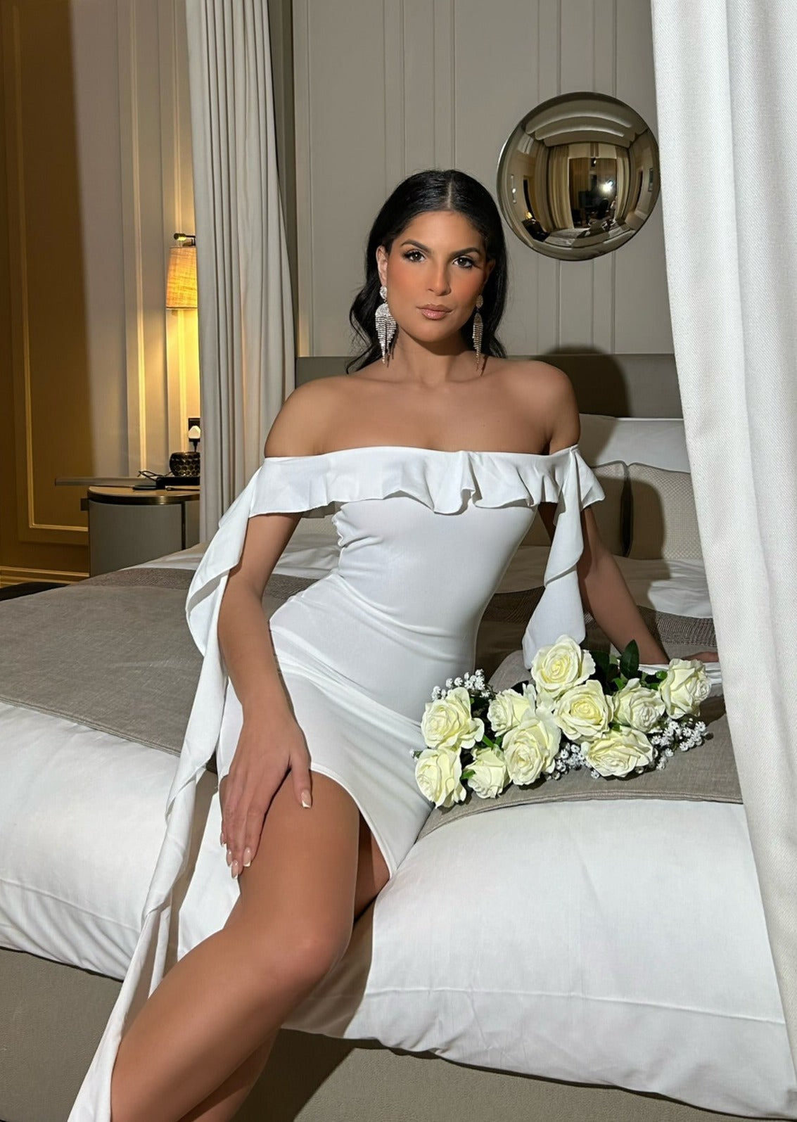 The 'Love Game' mini dress is a stylish and eye-catching summer party look. This white mini dress is crafted with a femme frill detail and an off the shoulder bodycon design for a flattering fit. The detailed frill neckline make this an unforgettable look.